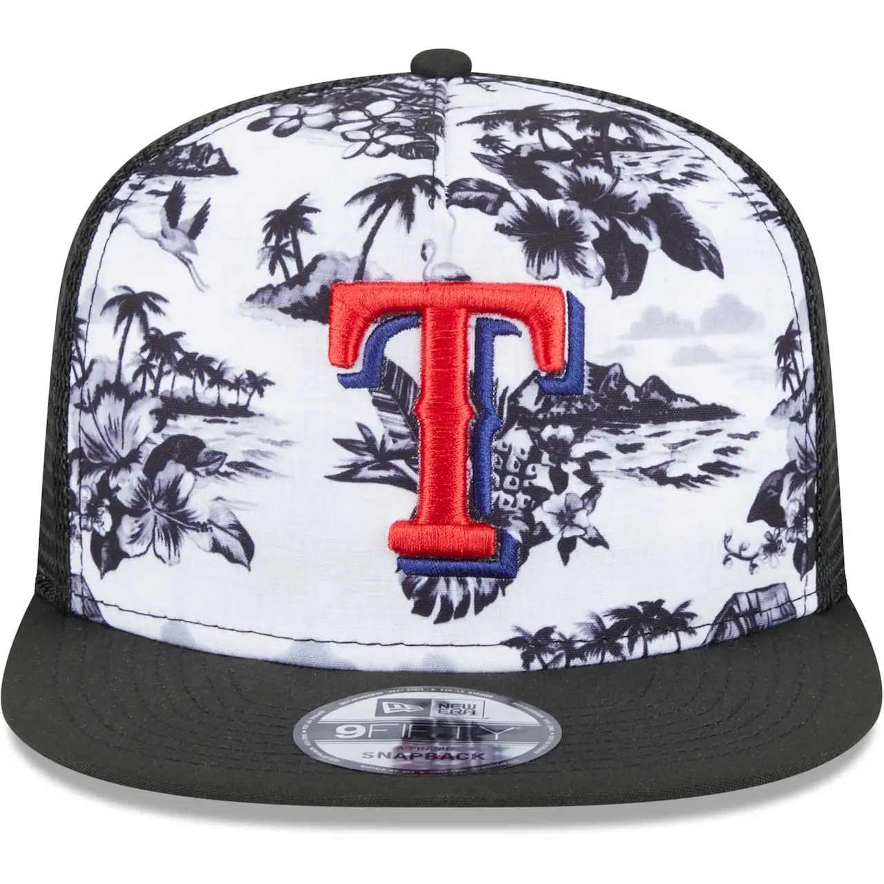 Kick back and relax in this Texas Rangers Vacay 2.0 A-Frame 9FIFTY cap from New Era. This trucker hat features a fun and calming pattern of palm trees, the beach and some flamingos with the Texas Rangers logo embroidered on top. The snapback construction will allow you to choose your comfort level and will help take your cares away.